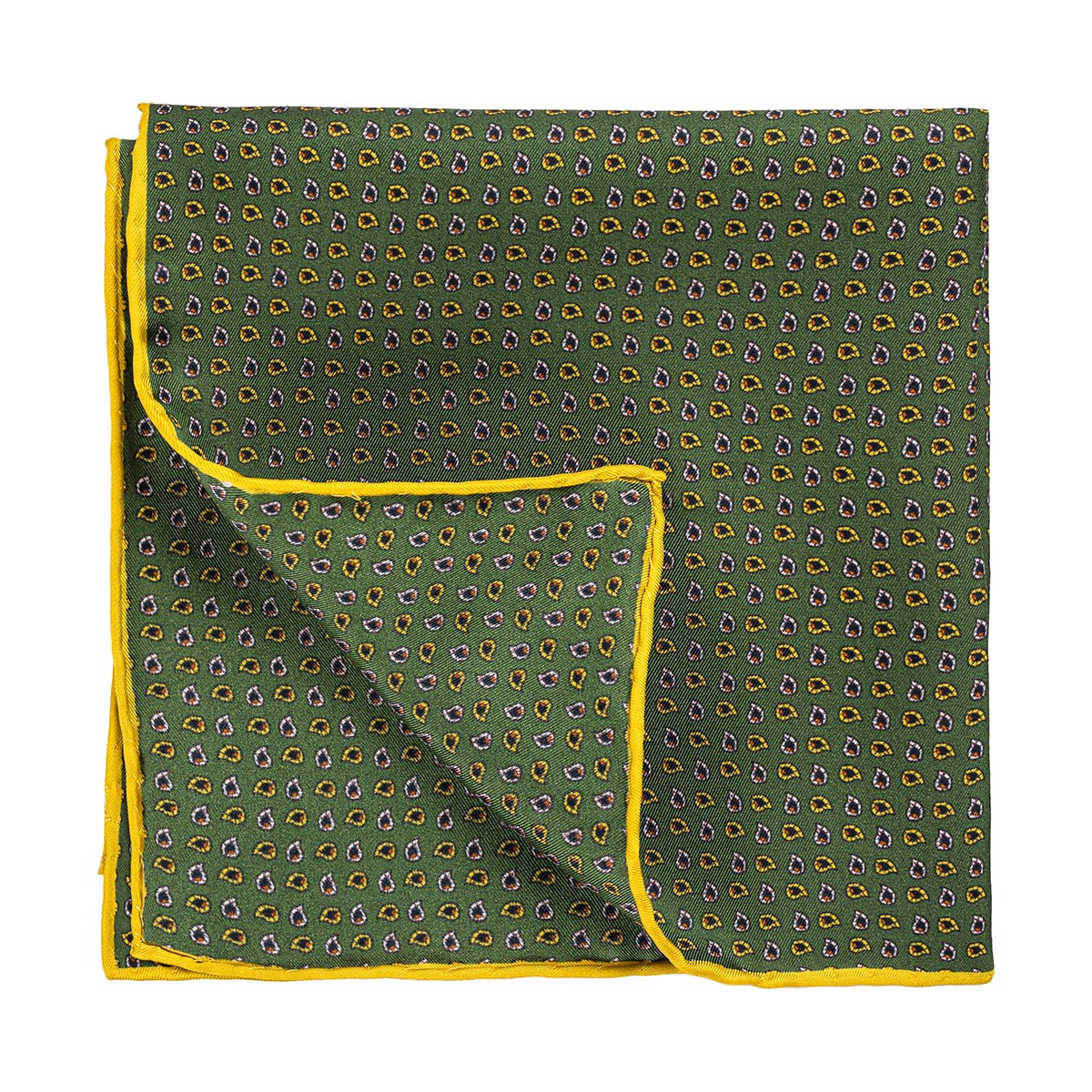 Μεταξωτό μαντηλάκι πέτου με χειροποίητο τελείωμα, σε πράσινο χρώμα με λαχουρ σχέδια σε κίτρινο και μαύρο χρώμα. Σπάστε τη μονοτονία και δώστε αέρα και άποψη στις καθημερινές και βράδυνες εμφανίσεις σας.
